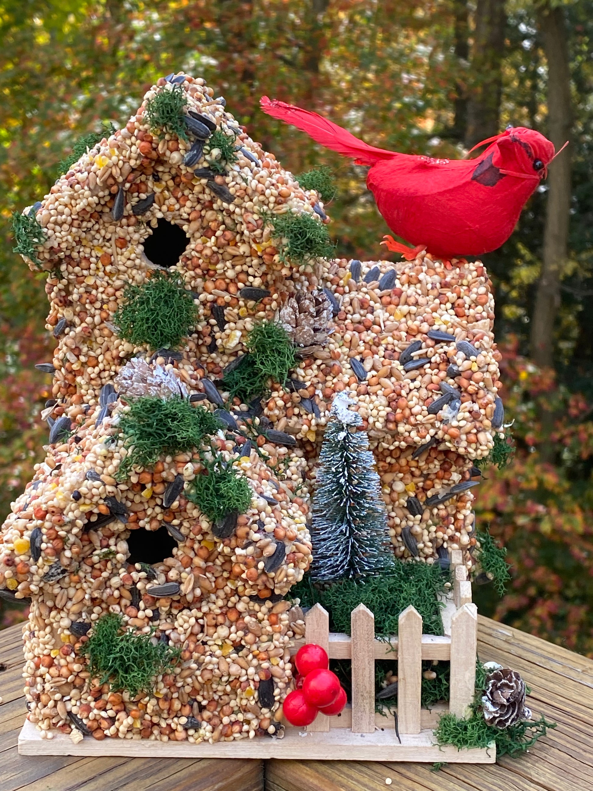 This large birdhouse has 4 holes for multiple bird entrances. It’s beautifully decorated with a Cardinal and Christmas tree. Before placing in the yard you may wish to gently remove the Cardinal to invite more birds to feed.