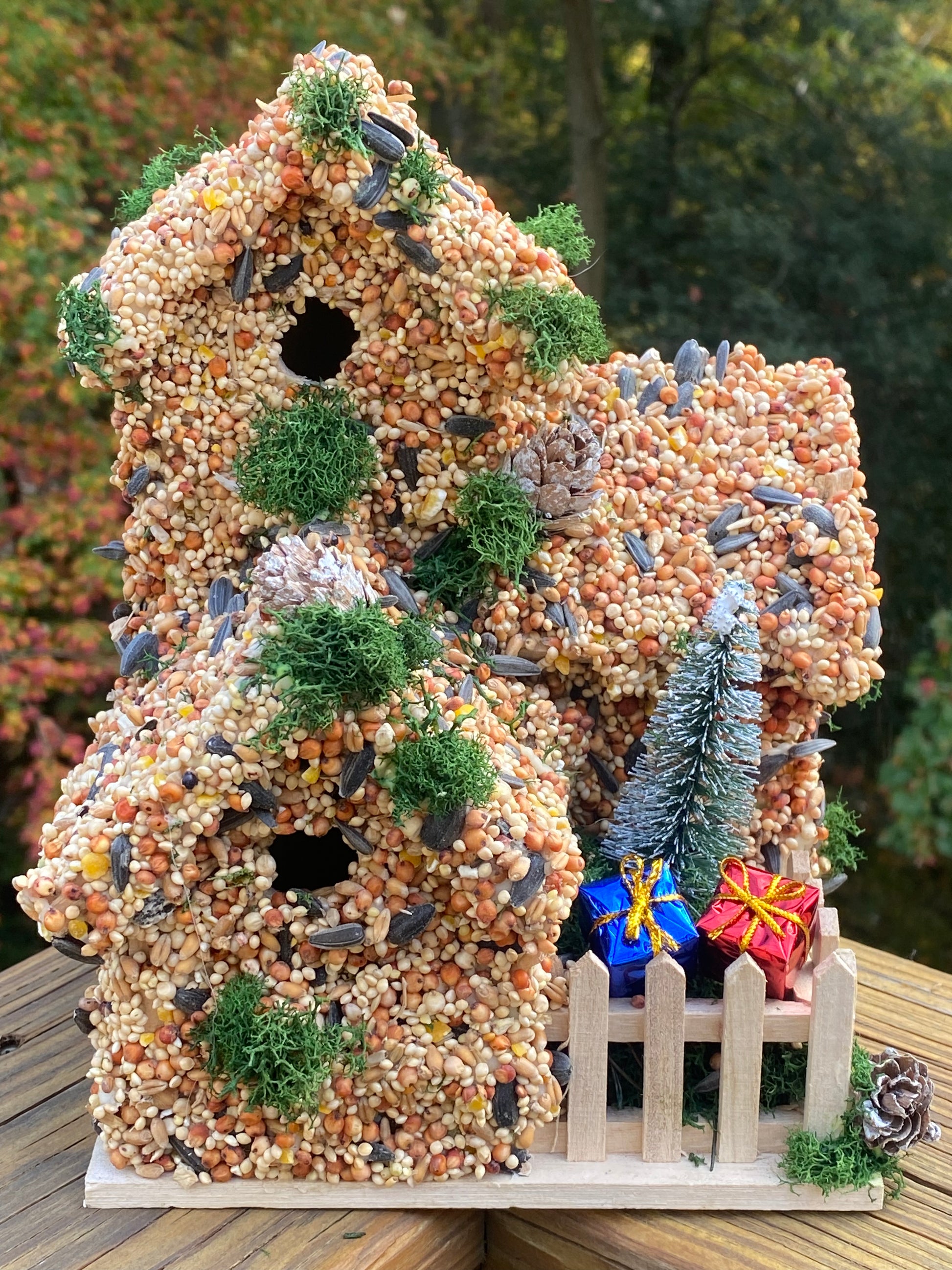 This rustic extra large birdhouse is perfect for any home. This birdhouse DOES NOT hang on a string and has 4 holes for multiple entrances for your birds. You can place it anywhere you would like to see your feathered friends feed.