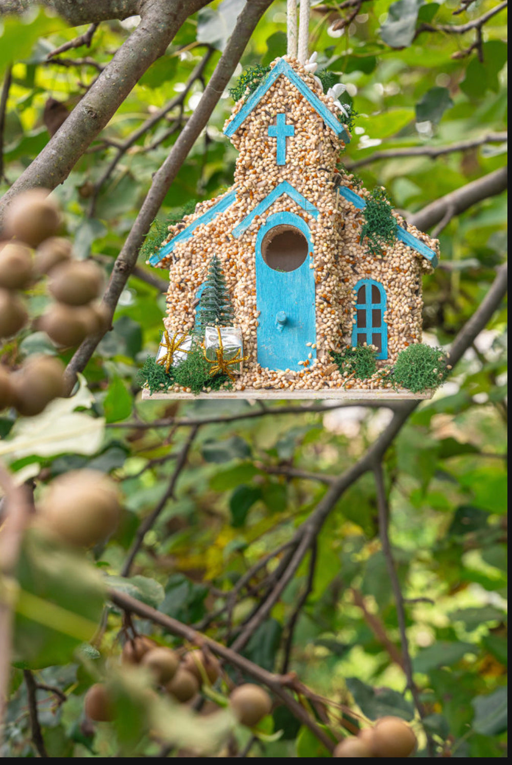 Welcome in the holiday season with this beautiful church. First I paint the church trim in a beautiful blue then cover it with premium bird seed. Finally this classic church is decorated with a Christmas tree out front with presents π underneath. On top of the roof two turtle ποΈ doves sit at rest.Β