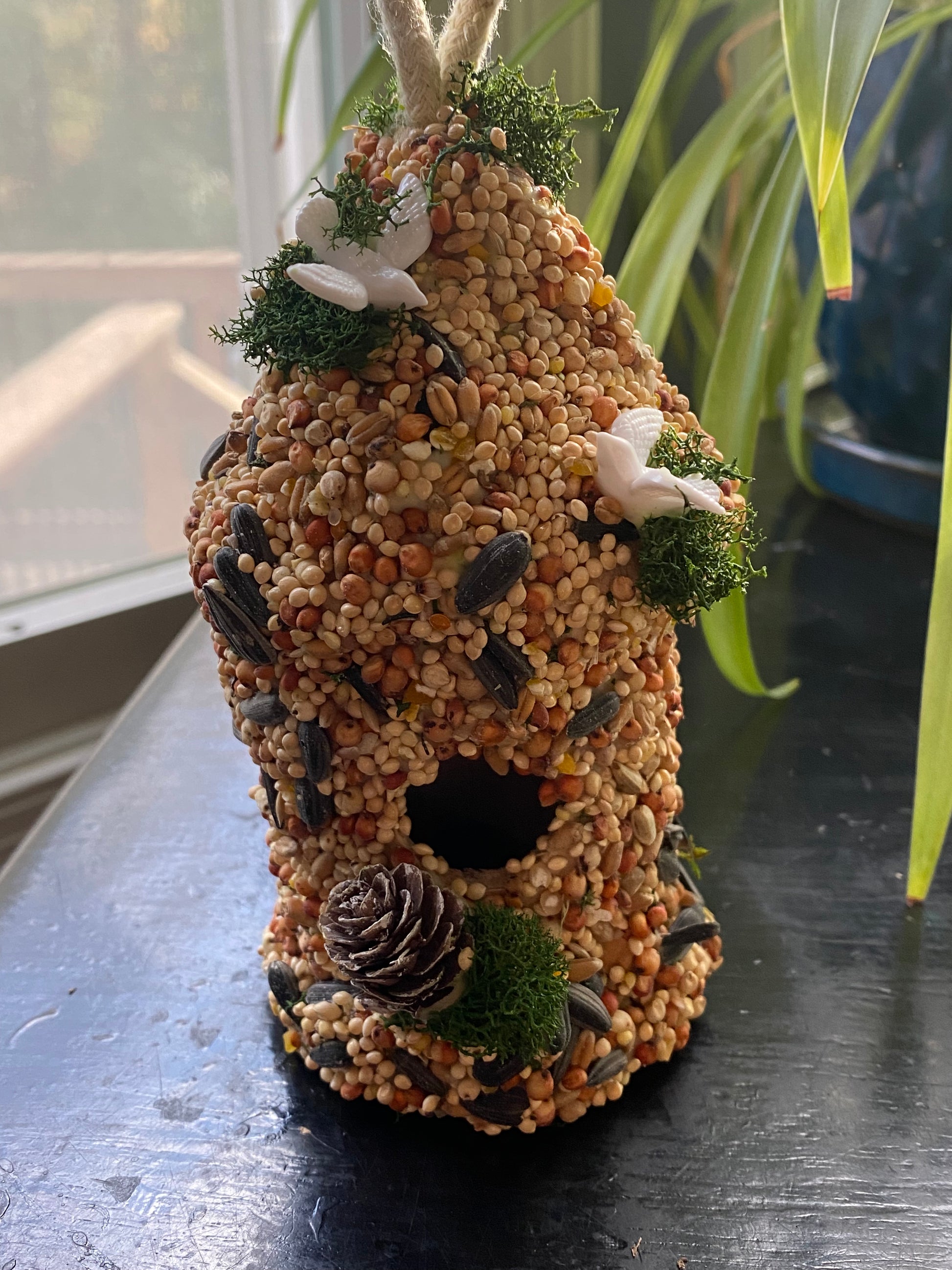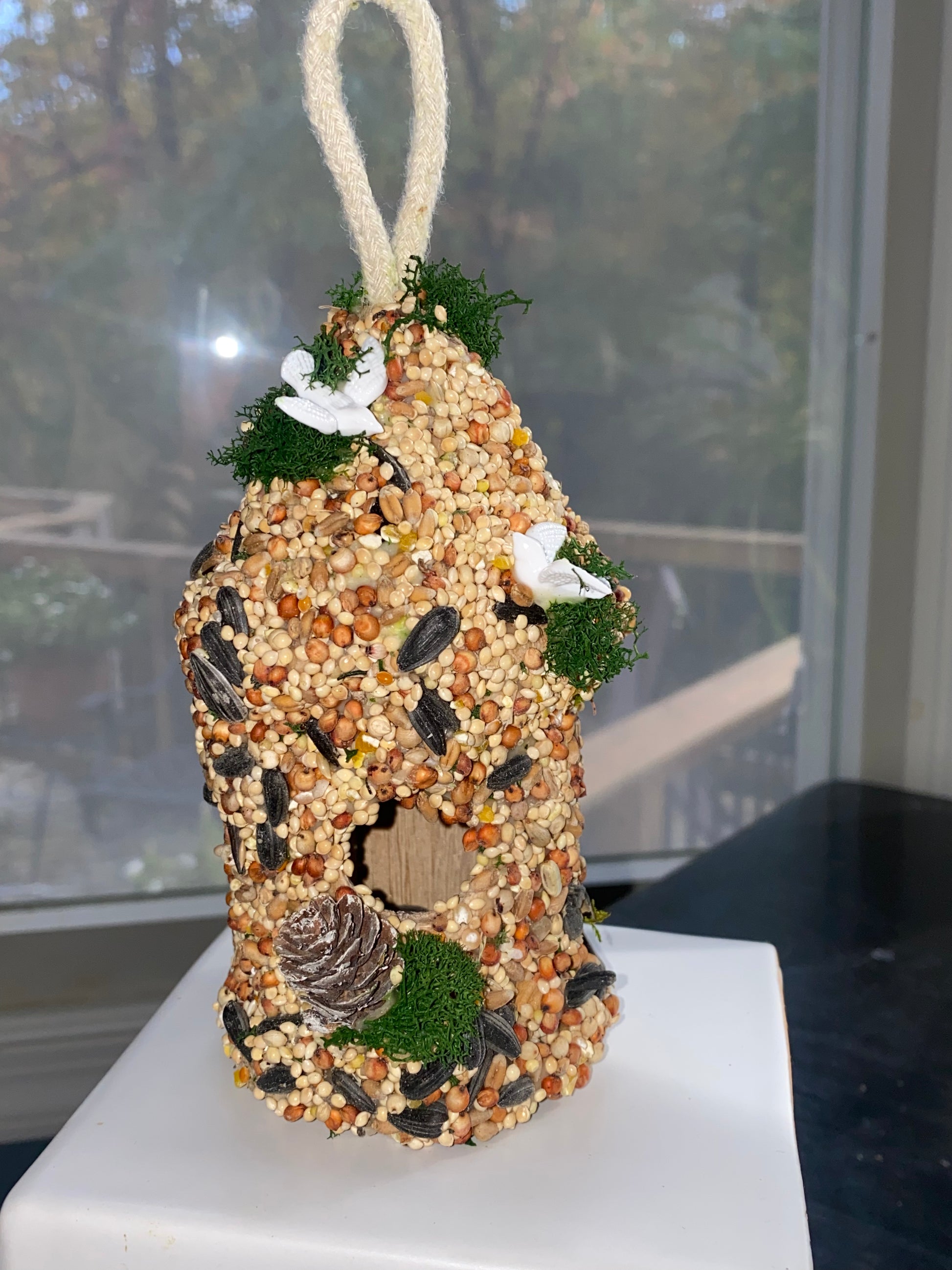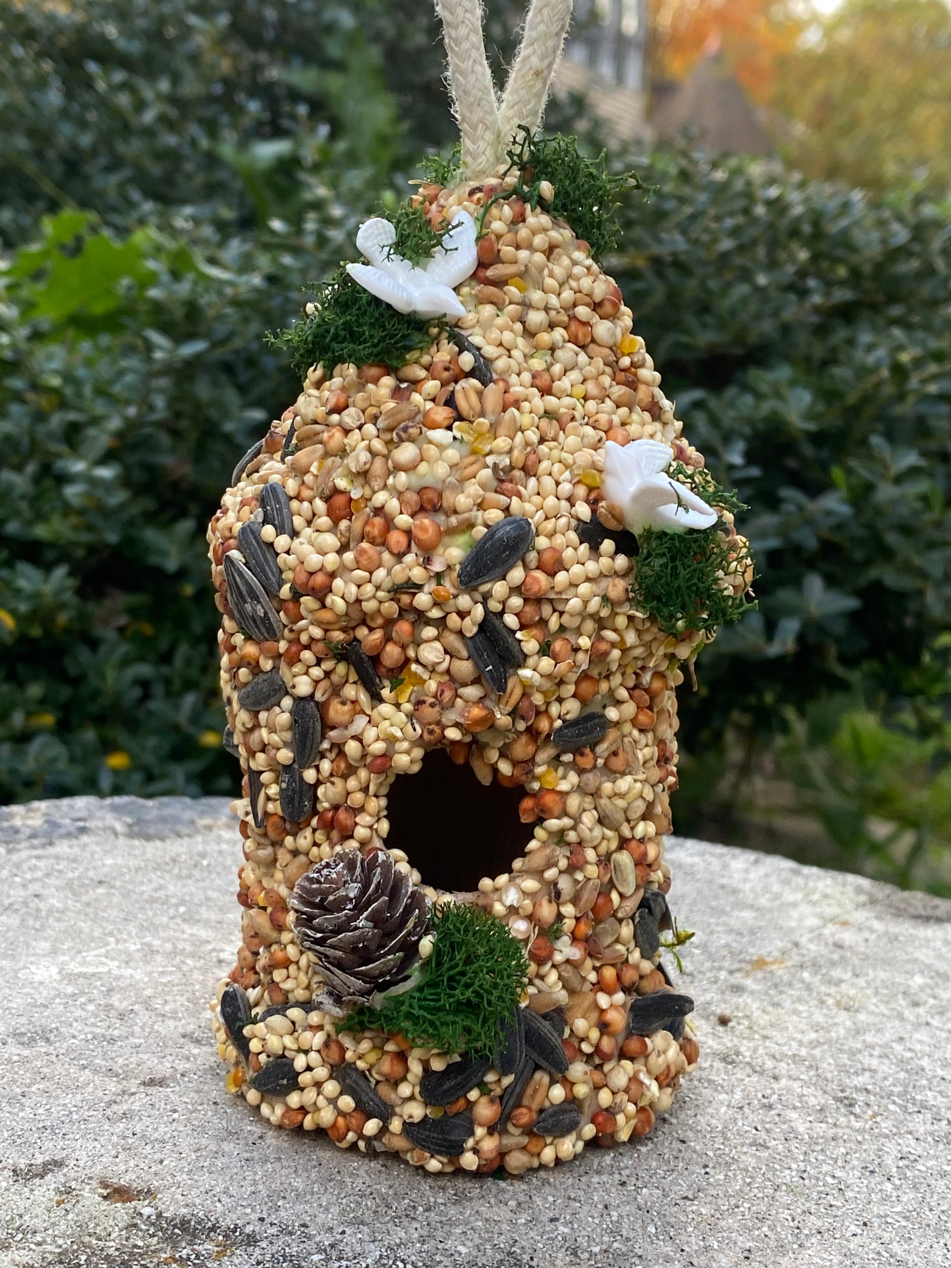 This round birdhouse is adorable and decorated with two turtle doves and pine cones. 🕊️
